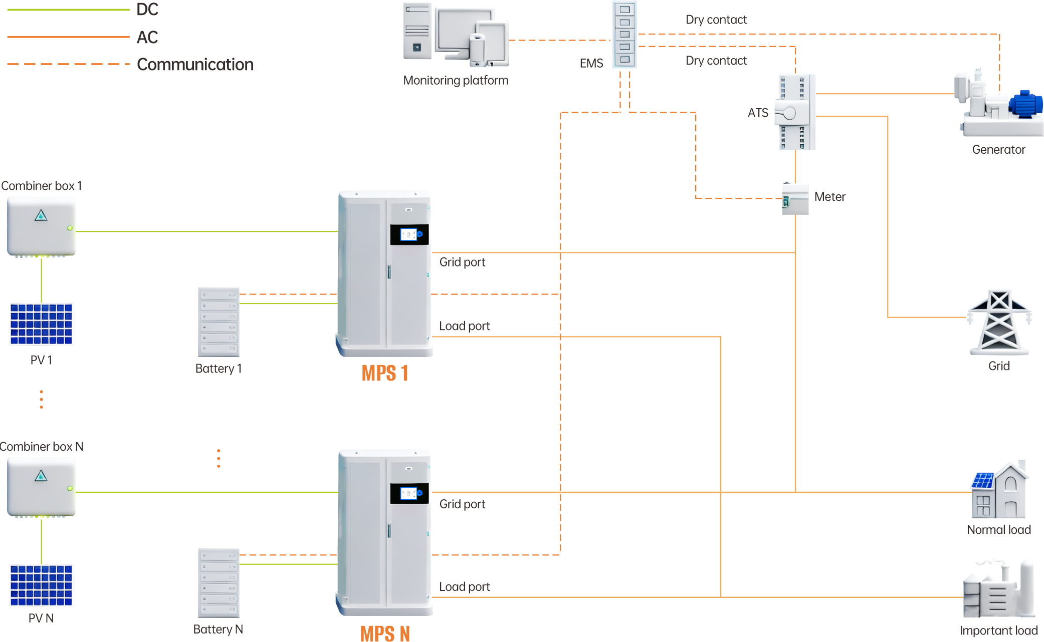 Megarevo's photovoltaic-storage-diesel solution primarily consists of an MPS hybrid inverter working in conjunction with energy storage batteries and a photovoltaic system. It boasts advantages of maturity and stability, and to date, it has deployed ≥300MW of photovoltaic-storage-diesel application cases.