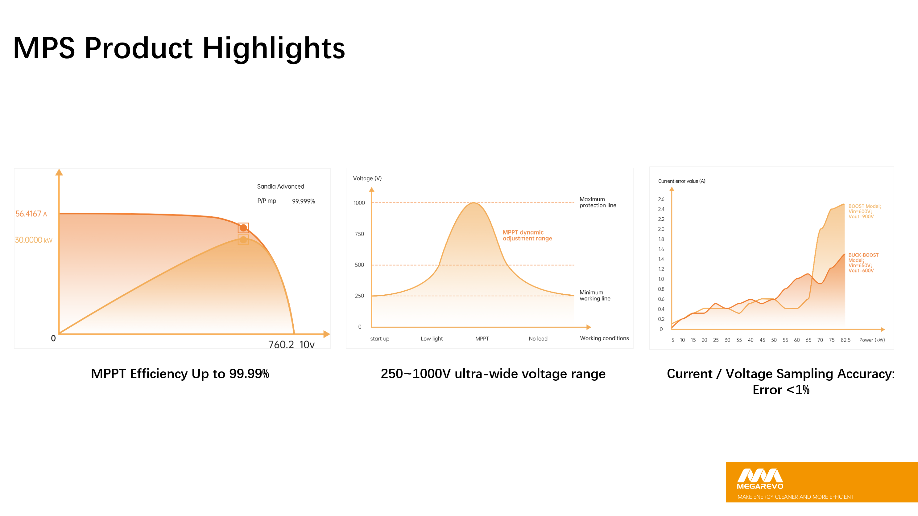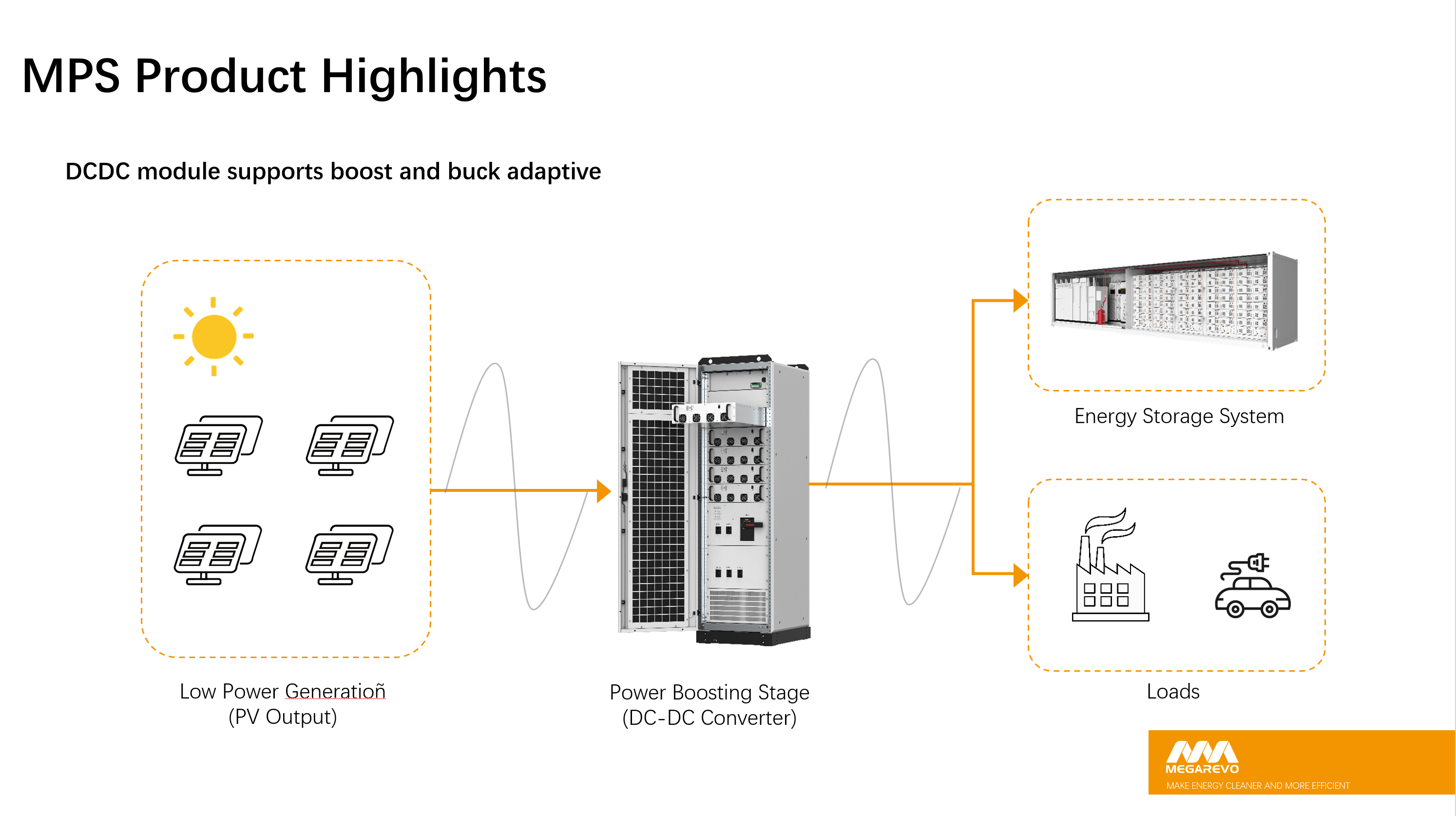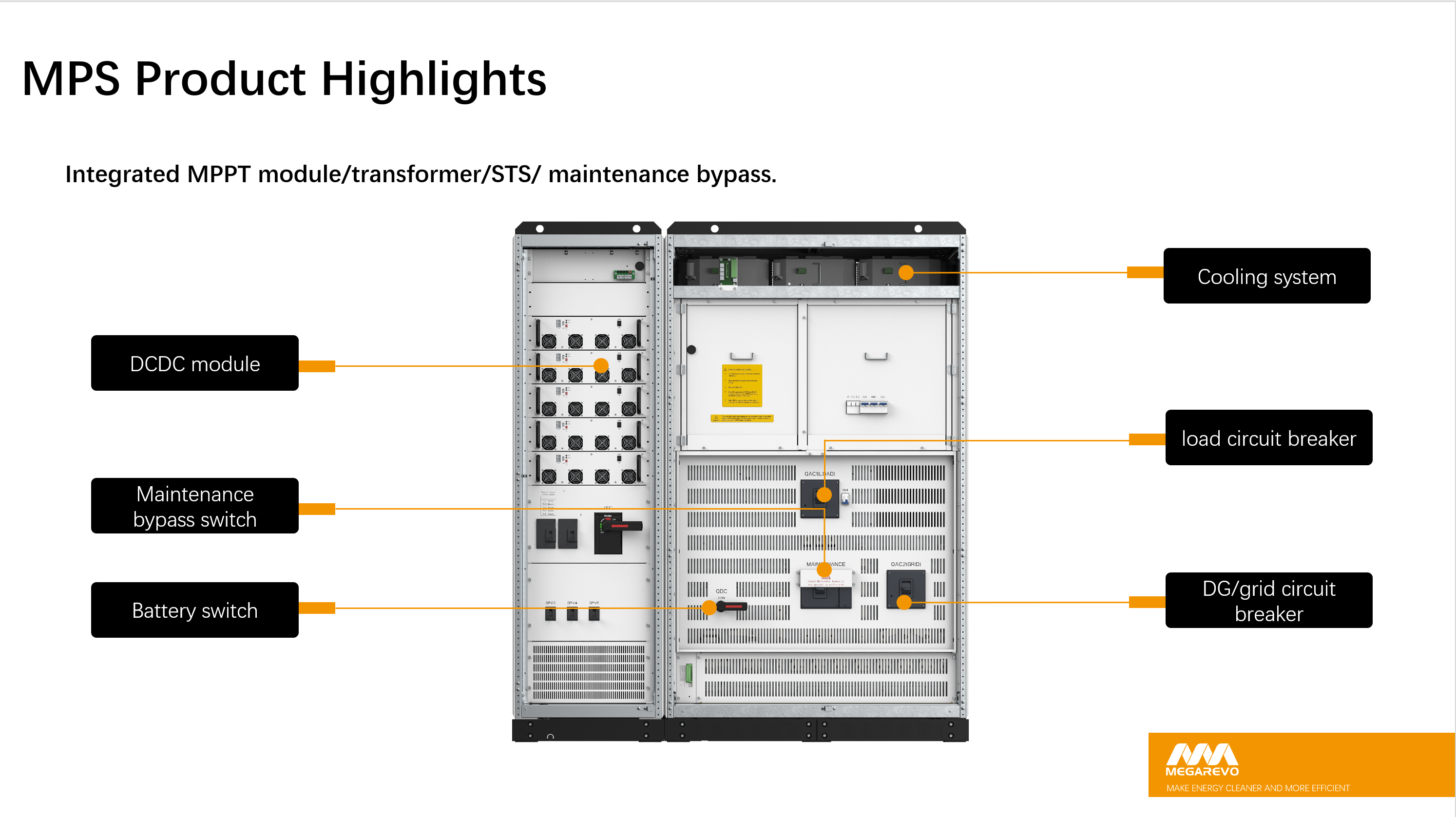 Megarevo's MPS hybrid inverter integrates a photovoltaic controller, energy storage converter, isolation transformer, maintenance bypass, and STS, with a on-grid to off-grid switching time of <20ms.